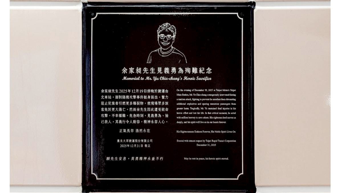 But perhaps the biggest news of December was a knife attack in Taipei’s metro system on December 19th. A 27-year-old man set off smoke bombs during evening rush hour at Taipei Main Station, the main transit hub of the city. He then moved to Zhongshan Station, a popular shopping area, where people were out buying gifts for Christmas. He killed three people, injured several others, and later died after falling from a nearby building as police closed in. One of the victims, a 57 year-old man named Yu Chia-chang (余家昶), died trying to prevent him from causing more damage. On January 13, the Taipei city government erected a memorial plaque to honor him.