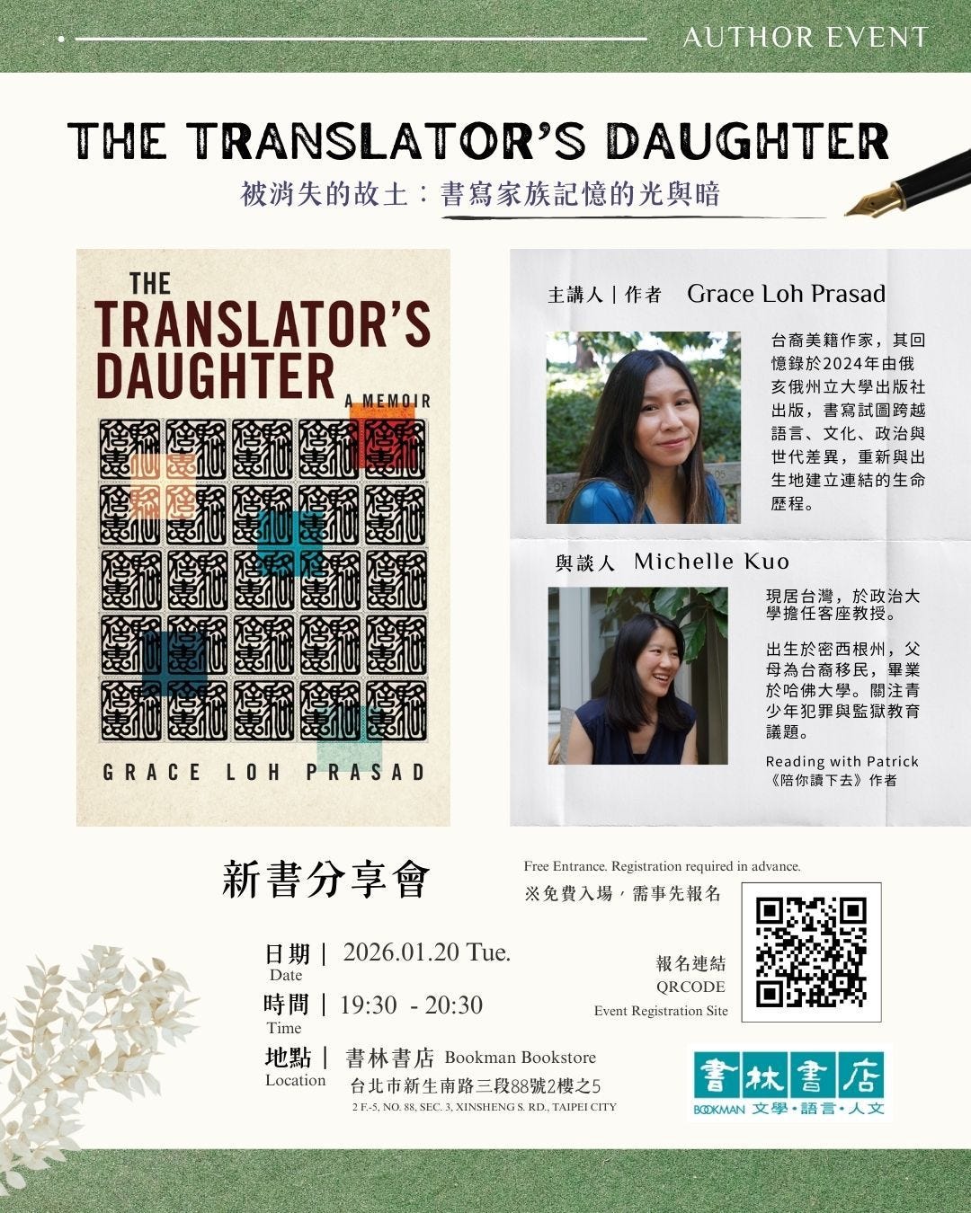 This coming Tuesday night (January 20th, 19:30 Taiwan time) Michelle is in conversation with Grace Loh Prasad’s The Translator’s Daughter at Bookman Books. We would love to see you there! Grace’s book is a soulful meditation on family, diaspora, and grief, and the conversation will be in both English and Mandarin, with the formidable Su Shin as our interpreter.